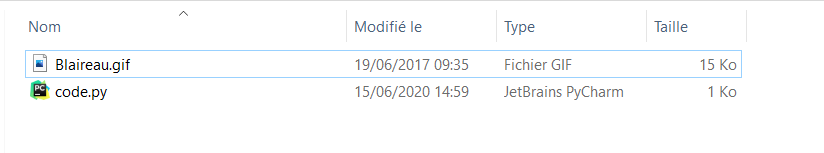 - tester le code ci-dessous ( attention, télécharger (cliquez-ici) et placer le fichier 'Blaireau.gif' dans le même dossier que le fichier du code python, dans l'exemple ci-dessous, le fichier python s'appelle code.py et il est au même endroit que l'image)
