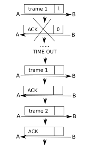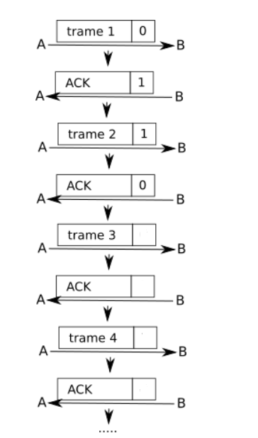 La règle est relativement simple : la première trame envoyée par A aura pour drapeau 0, dès cette trame reçue par B, ce dernier va envoyer un accusé de réception avec le drapeau 1 (ce 1 signifie "la prochaine trame que A va m'envoyer devra avoir son drapeau à 1").