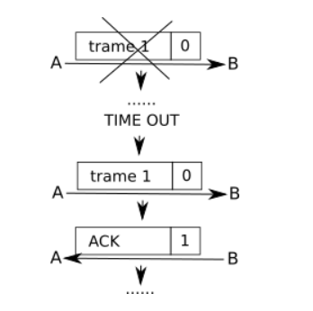 La trame est perdue, au bout d'un certain temps ("TIME OUT"), A n'a pas reçu d'accusé de réception, la trame est considérée comme perdue, elle est donc renvoyée.