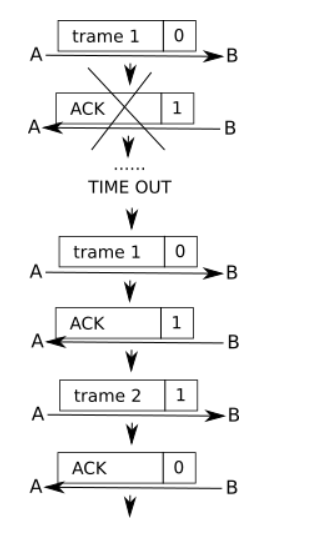 Le système de drapeau est complété avec un système d'horloge côté émetteur. Un "chronomètre" est déclenché à chaque envoi de trame, si au bout d'un certain temps, l'émetteur n'a pas reçu un acquittement correct (avec le bon drapeau), la trame précédemment envoyée par l'émetteur est considérée comme perdue et est de nouveau envoyée.