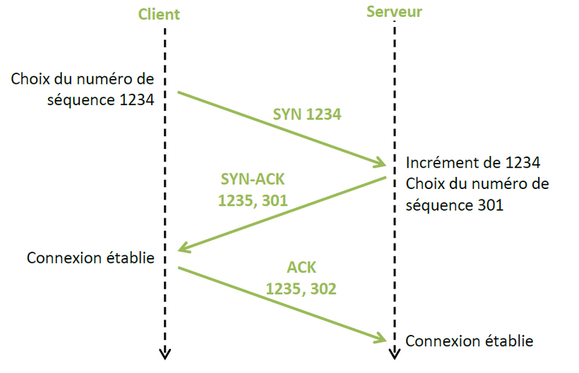 Le client choisit aléatoirement un numéro (1234 dans l’exemple ci-dessous) et envoie un paquet TCP étiqueté SYN ( synchronized) avec le numéro 1234. Le serveur se choisit aussi un nombre aléatoirement (301 dans l’exemple) puis répond au client qu'il veut bien communiquer avec un paquet étiqueté (SYN-ACK : synchronized acknowledgement), le paquet SYN-ACK contient le numéro du client incrémenté de 1 soit 1235 et son propre numéro ( 301) , sur réception de ce paquet le client considère sa connexion établie. Le client renvoie un paquet ACK avec son numéro et celui du client incrémenté (1235, 202) , sur réception de ce paquet le serveur se considère comme connecté.
