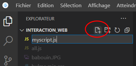 2. Créer un nouveau fichier appelé myscript.js dans VSCodium pour saisir votre code JavaScript: