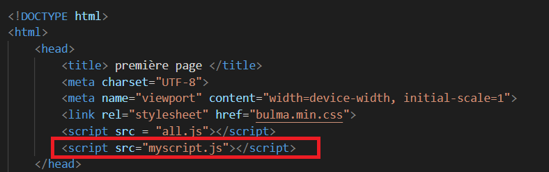 3. Lier votre fichier index.html avec votre fichier myscript.js dans la partie head de votre page web index.html: <script src="myscript.js"></script>