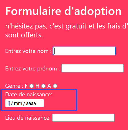 Vous allez écrire le code JavaScript qui permettra d'ajouter un calendrier dans le formulaire de la page index.html. Techniquement JavaScript doit ajouter le code html qui demande au navigateur d'afficher un calendrier. Le code html sera placé dans le paragraphe d'id=birthday avant que le navigateur affiche la page: