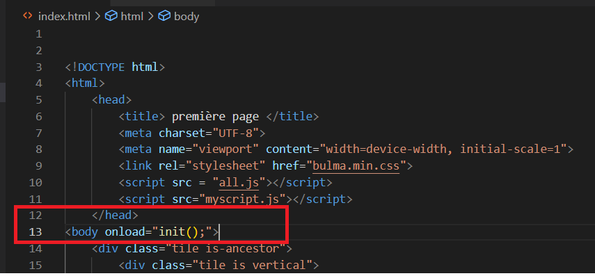 - Dans le fichier index.html, mettre la ligne de code qui associe la fonction init() à l'événement onload; c'est la balise <body> qui contient le code html des éléments à afficher à l'écran, elle est la plus adaptée à prendre en compte cet événement:
