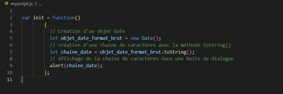- Vous allez maintenant modifier votre fonction init() pour afficher la date générée dans une boite de dialogue alert: