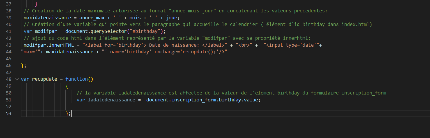 - vous allez maintenant modifier la fonction init() pour obtenir l'affichage du calendrier au moment du chargement de la page avec impossibilité de choisir des dates de naissance absurdes comme être né(e) le jour même. Les commentaires en vert expliquent les lignes de code: