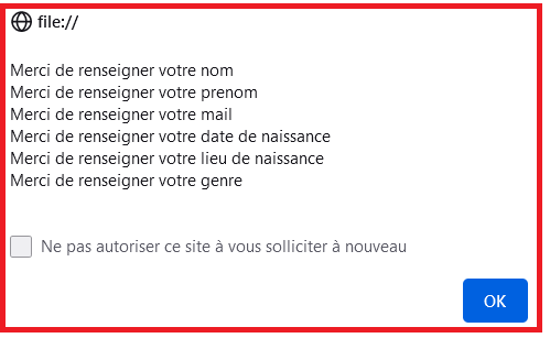 - ouvrir la page index.html avec firefox, envoyer le formulaire sans remplir aucun champ, vous devriez avoir le message: