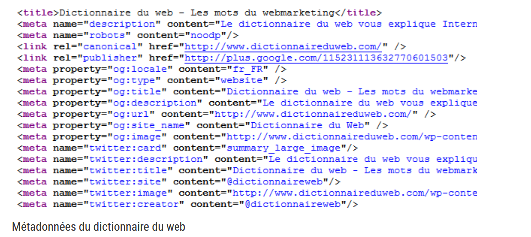 - Les méta-données contenues dans le code html de la page sont utilisées :