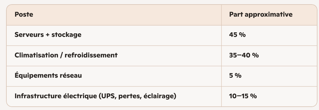 La consommation électrique d'un data center peut être répartie de la manière suivante:
