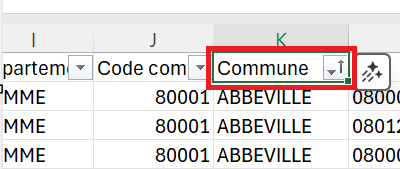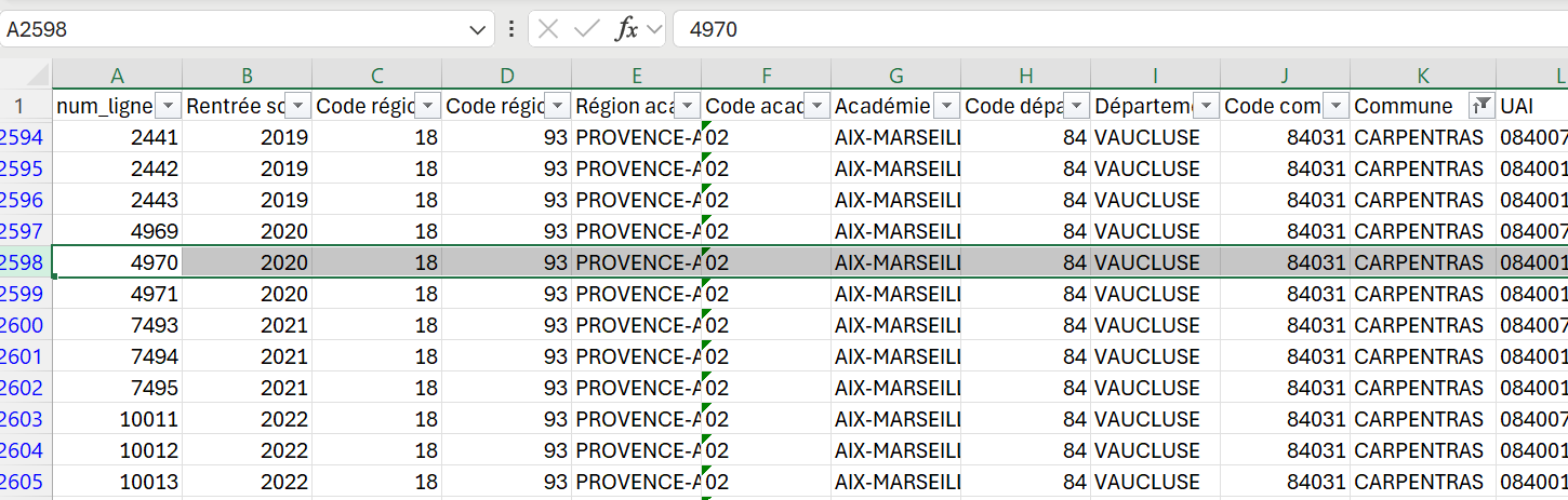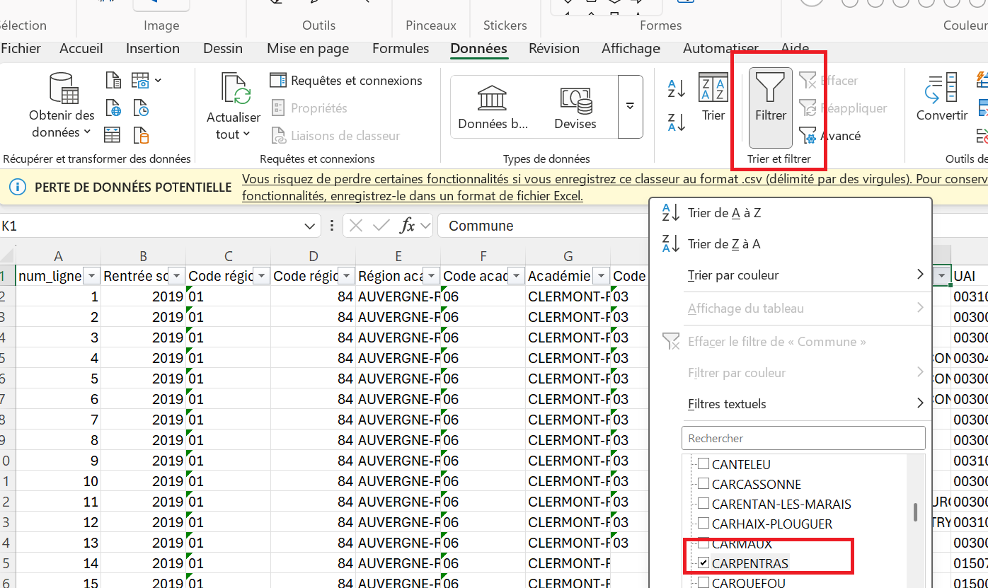- Ouvrir le document avec Excel et rechercher la ligne concernant le lycée JH Fabre. Pour limiter le nombre de données: utiliser l’outil Filtrer (encadré en rouge ci-dessous, cliquer sur la petite flèche à droite de Commune (encadré en rouge ci-dessous), désélectionner toutes les villes puis cocher Carpentras, valider avec OK.