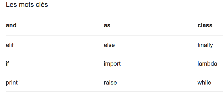Certaines combinaisons de caractères sont interdites parce qu'elles donnent un mot clé du langage ( un mot clé est un mot réservé qui indique quelque chose de précis à l'interpréteur, la liste des mots réservé est donné ci-dessous: