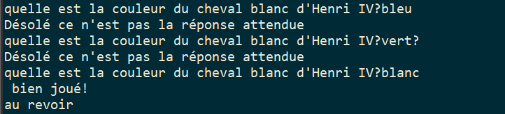 réponse = input("quelle est la couleur du cheval blanc d'Henri IV?")