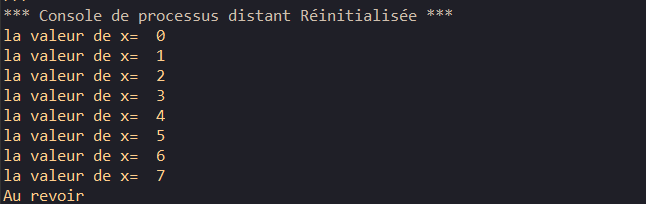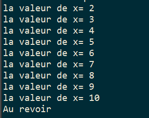 Dés que x atteint la valeur maximale de la plage ( ici le nombre 7) la boucle s'interrompt et n'exécute plus le bloc d'instructions associé à la boucle for , ici le programme passe à l'instruction qui suit le bloc for et affiche Au revoir.