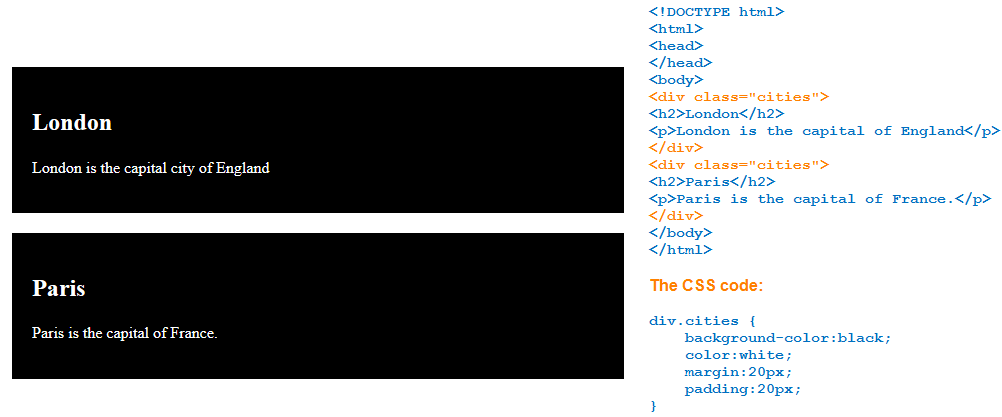Les attributs class et id sont similaires. Il y a cependant une différence qui est que deux éléments HTML différents ne peuvent pas avoir le même Id alors que deux éléments HTML différents peuvent avoir la même class. On donnera la même class à des éléments qui doivent avoir le même design et un id aux éléments qui ont besoin d'un décoration unique. L'élément <div> est une balise HTML en paire de type bloc qui est souvent utilisée comme conteneur d'autres éléments. Exemple de design commun pour deux <div> avec l'attribut class: