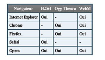 Voici la compatibilité des codecs vidéos avec les principaux navigateurs au moment où ont été écrites ces lignes: