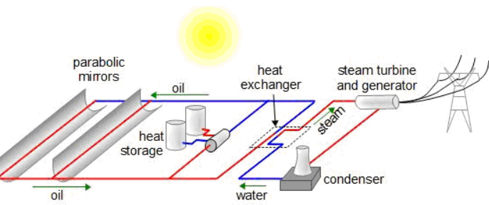 The figure illustrates how a commonly used parabolic CSP system works. The collectors concentrate the sunlight, collect it as heat energy and store it. Then, the heat energy is used generate steam that runs heat engines to produce electricity, which is transferred to the grid. Heat engines have been around since antiquity; but, were only made into useful devices during the industrial revolution. They continue to be developed today and are very mature technologies. Most of the electricity generated today is by heat engines driven by burning of fossil fuels or hydropower. Their efficiency is limited by the laws of thermodynamics.