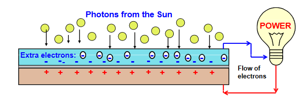 Bombardments of photons from solar rays energize electrons which flow from the negative part to the positive part through the conductive circuit: