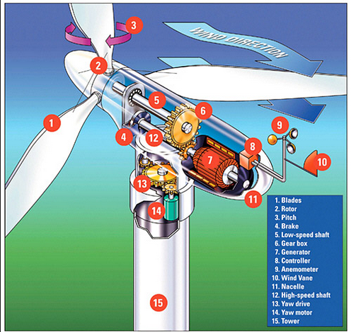 The wind turns two or three propeller-like blades around a rotor. The rotor is connected to a main shaft, which spins a generator to create electricity. Wind is a form of solar energy and is a result of the irregular heating of the atmosphere by the sun, the irregularities of the earth's surface, and the rotation of the earth. Wind turbines convert the kinetic energy in the wind into mechanical power. This mechanical power can be used for specific tasks (such as pumping water) or a generator can convert this mechanical power into electricity.