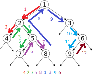 A) Parcours en profondeur infixe: Dans un parcours en profondeur infixe, on liste chaque nœud ayant un fils à gauche la seconde fois qu’on le voit et chaque nœud sans fils à gauche la première fois qu’on le voit, on commence par parcourir le sous-arbre de gauche. Les numéros sur les segments de l'arbre ci-dessous vous montre le sens parcours: la valeur 4 (sans fils à gauche) est affichée la première fois qu'elle est rencontrée soit à l'étape 2 du parcours, la valeur 2 qui a un fils à gauche sera affichée, la seconde fois qu'on le parcourt, au retour de l'étape 2 soit à l'étape 3. Pour l'arbre ci-dessous, on obtiendra l'ordre d'affichage: 427581396