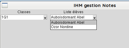 Le contenu de la liste déroulante Liste élèves dépend de la classe qui est sélectionnée, il faut donc récupérer l'élément sélectionné dans la liste Classes et agir en conséquence, la liste sera initialement remplie avec les éléments de la première classe qui est affichée ( ici 1G1), pour avoir les élèves de la 1G1 au lancement de l'application, on modifie la fonction initialisation() en ajoutant la requête requete_eleves ( code lignes 12-13 ci-dessous), l'itérateur for à la ligne 14 récupère le résultat de cette requête et remplit la liste liste_eleves_classe_selectionnée, cette liste est ensuite affectée à la liste déroulante à la ligne 28, le premier élement de la liste déroulante est affichée par défaut grâce à la ligne de code 30 :