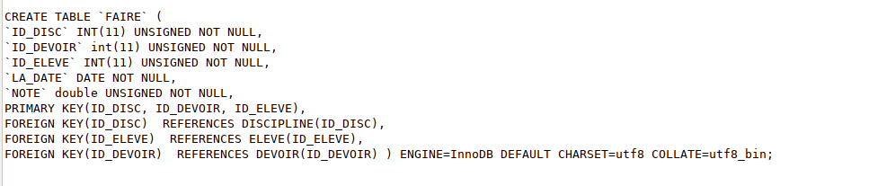 - On vous donne ci-dessous la requête qui a permis de créer la table FAIRE.