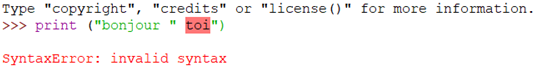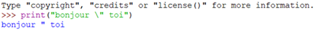 Si on veut inclure le caractère « " » comme caractère quelconque de la chaîne passée en argument à la fonction print(..), par exemple "bonjour " toi " un problème survient puisque ce caractère est réservé pour délimiter la chaîne à afficher, le langage python permet d’utiliser le caractère d’échappement \ qui indique à l’interpréteur que le caractère qui suit doit être ignoré. Vous pouvez voir ci-dessous l’affichage du caractère " « échappé » :