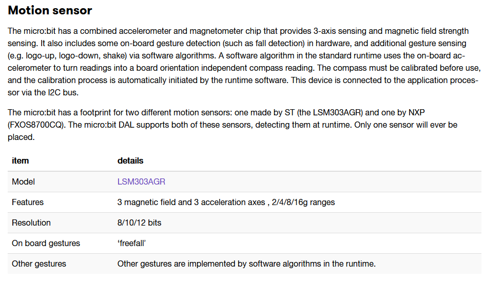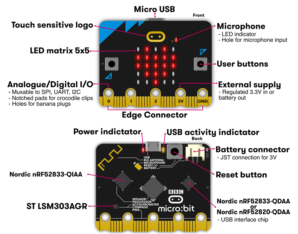La carte embarque une matrice 25 leds ( 5X5) qui permet d'afficher des messages, un microphone, un haut parleur, un accéléromètre, un magnétomètre, un capteur de température, deux boutons poussoirs, un circuit de communication sans fil 2.4 GHhz ( bluetooth ou RF).