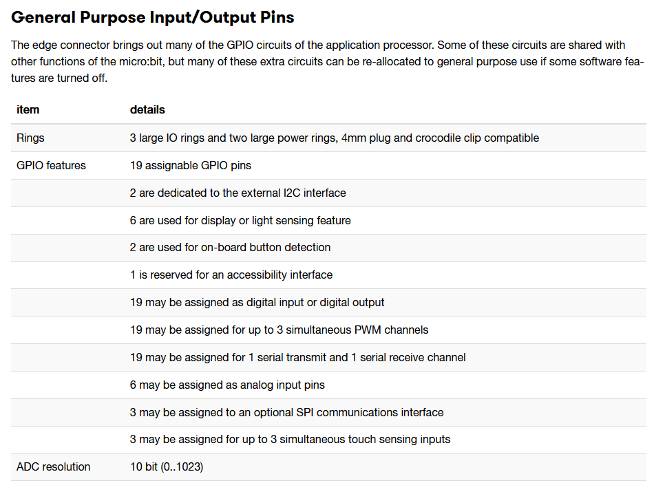 ATTENTION, quand on utilise une broche GPIO comme entrée d'information, il ne faut pas appliquer une tension supérieure à 3V ( les composants de type capteurs pour Arduino qui fonctionnent en 5V ne conviennent pas sauf si on utilise une carte électronique d'adaptation conçue pour interfacer le capteur avec la carte Micro:bit )