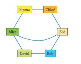 - Alice n'est pas liée avec Chloé, la case Ligne Alice et colonne Chloé = 0 et la case Ligne Chloé et colonne Alice= 0