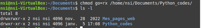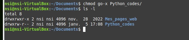 chmod go-x Python_codes => retire le droit de parcourir le dossier ( x) aux membres du groupe nsi et aux autres utilisateurs du pc