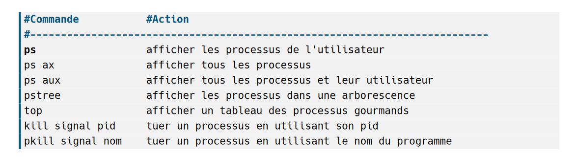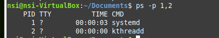 ps -p 1,2: affiche les processus de pid 1 et 2