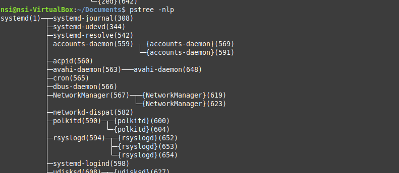Affichage de l'arborescence des processus par ordre alphabétique, avec leur pid (option -p), format ligne longue (option -l): pstree -lp
