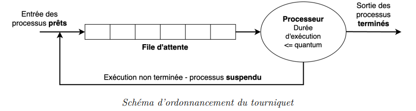 L’ordonnanceur est la composante du noyau système d’exploitation qui gère l’accès au processeur pour les différents processus en cours d'exécution sur le PC. Nous allons nous intéresser à l’algorithme d’ordonnancement du tourniquet dont le fonctionnement est résumé ci-dessous :