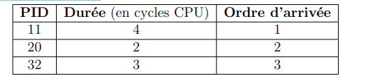 On considère trois processus soumis à l’ordonnanceur au même instant pour lesquels on donne les informations ci-dessous: