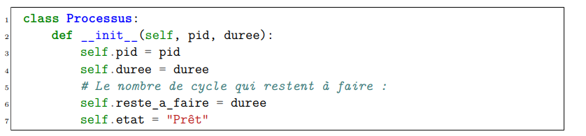 On définit la classe processus qui permet d'obtenir de créer des instances de processus (objets processus) , un objet processus possède 4 attributs ( pid, duree, reste_à faire et état) . Lors de la création de l'instance, le processus est mis dans la file avec l'état Prêt. A chaque cycle de cpu, l'attribut reste_à faire est décrémenté de 1 ( diminué de 1).
