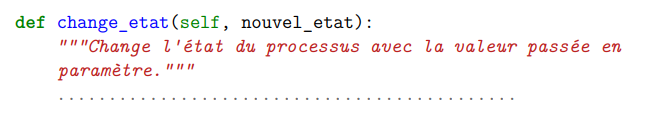 e) Ajouter la méthode change_etat (self, nouvel_etat) à la classe Processus, cette méthode met à jour la valeur de l'attribut etat qui doit prendre la valeur de nouvel_etat