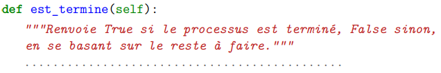 f) Ajouter la méthode est_terminé (self) à la classe Processus, cette méthode renvoie True si l'attribut reste_a_faire contient un nombre inférieur ou égal à 0.