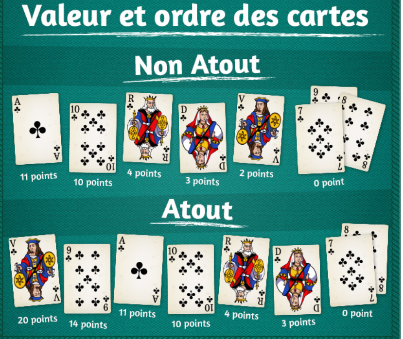 Par exemple pour un valet la valeur est 2 si la carte est non atout sinon sa valeur est 20.