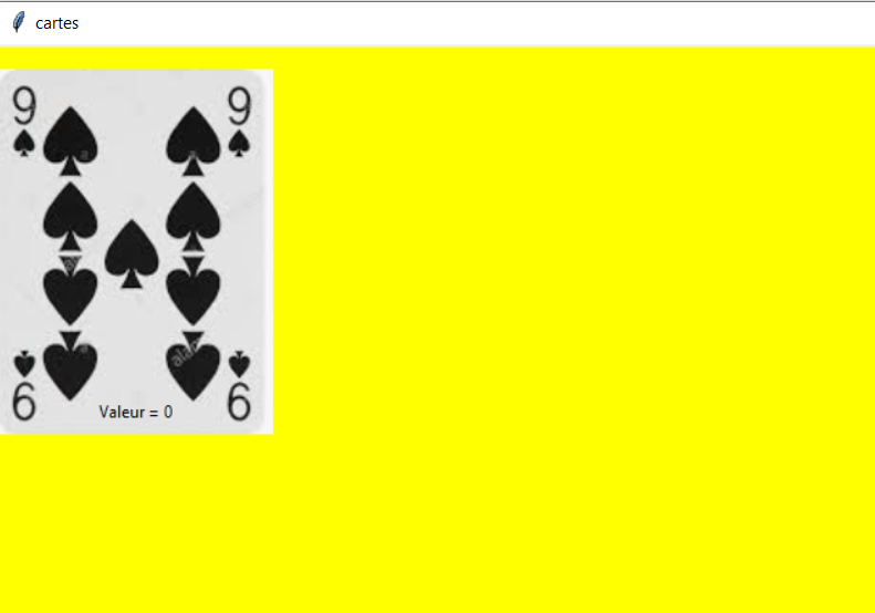 Le programme ci-dessous affiche l'image d'un 9 de pique sur un canvas placé dans une fenêtre Tkinter, on indique sa valeur sur la carte à l'aide de la variable valeur_9_pique. Le canvas s'appelle fond, il est jaune, un objet canvas permet de dessiner dans une fenêtre, on peut insérer une image sur le canvas et écrire du texte. Ici on ajoute l'image 9_pique.PNG et on écrit le contenu de la variable valeur_9_pique: