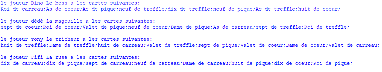 On considère maintenant une partie de contrée, chaque joueur se voit distribuer 8 cartes, écrivez le code qui distribue aléatoirement à chacun des 4 joueurs 8 cartes de la liste liste_cartes. Vous afficherez ensuite les cartes reçues par chaque joueur dans la console ( Voir remarques ci-dessous).