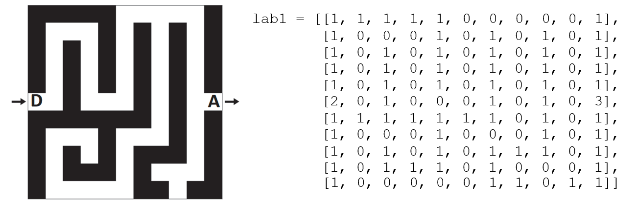 Ainsi, en Python, le labyrinthe ci-dessous est représentée par le tableau de tableaux lab1: