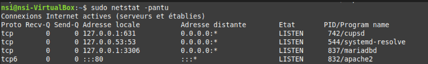 - Lancer la commande sudo netstat -pantu pour connaître toutes les connexions actives sur votre machine.