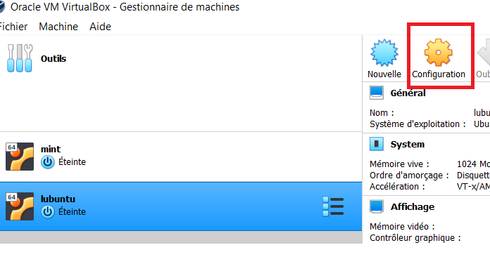 Choisir une machine virtuelle, cliquer sur Configuration ( encadré rouge ci-dessous),