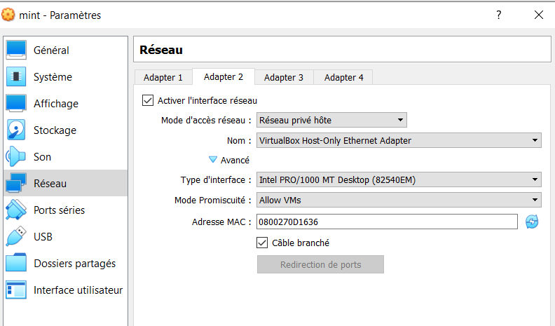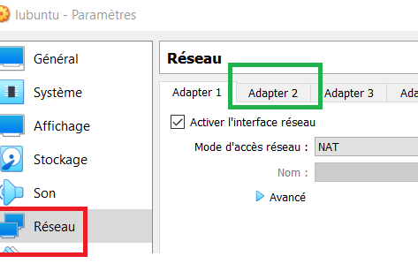 choisir le menu Réseau ( encadré rouge ci-dessous) puis sur Adapter 2 (encadré vert ci-dessous) :