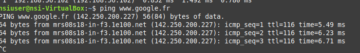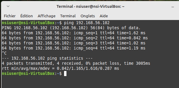 ping 192.168.56.102 pour tester la connectivité avec lubuntu.