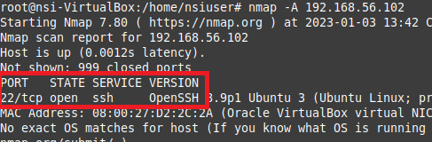 Sur Linux mint, saisir la commande nmap -A 192.168.56.102 ( remplacer l'ip par celle de votre machine virtuelle Linux lubuntu )