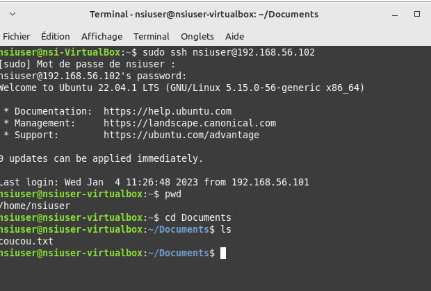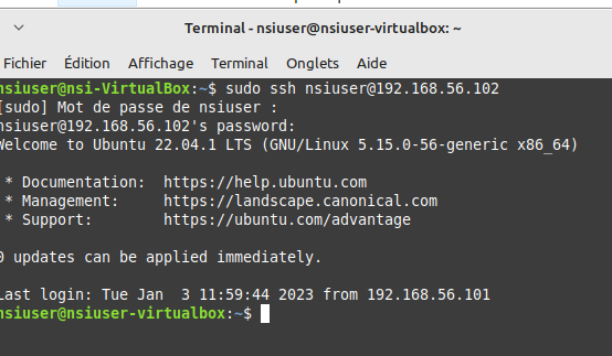 - Depuis Linux mint, Ouvrir un terminal et saisir la commande sudo ssh nsiuser@192.168.56.102 ( ATTENTION remplacer l'ip après le @ par celle de votre lubuntu), ssh vous ouvre une session console distante sur lubuntu: