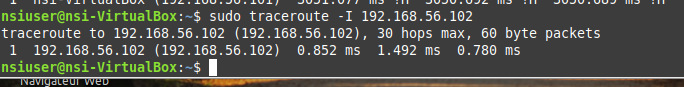 Pour connaître le chemin emprunté par un paquet à destination de lubuntu saisir la commande sudo traceroute - I 182.168.56.102