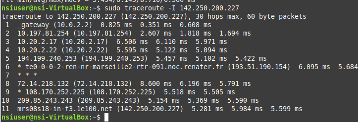 - saisir ensuite la commande sudo traceroute - I 142.250.200.227, vous pouvez voir ci-dessous que 11 routeurs ont été traversés pour atteindre la destination: